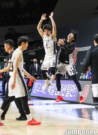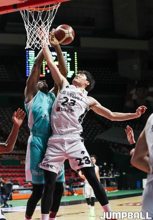 [점프볼=윤민호 기자]24일 사직실내체육관에서 열린 2020-2021 현대모비스 프로농구 부산 KT와 창원 LG의 경기에서 LG 최승욱이 KT 김영환의 수비를 피해 슛을 하고 있다.