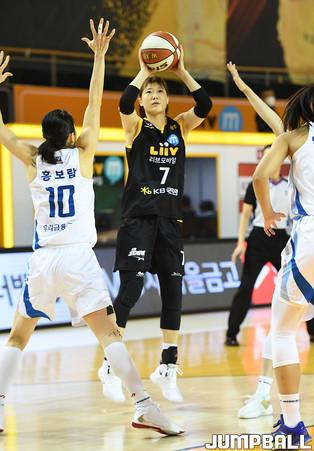 [점프볼=청주/문복주 기자] 21일 청주체육관에서 열린 KB국민은행 LiiV M 2020~2021 여자프로농구 청주 KB스타즈와 아산 우리은행의 경기, KB스타즈 강아정이 점프슛을 시도하고 있다.