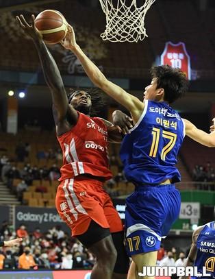 13일 잠실실내체육관에서 열린 2021-2022 KGC인삼공사 정관장 프로농구 서울 삼성과 서울 SK의 S-더비 4차전, SK가 98-74로 삼성에 승리했다.