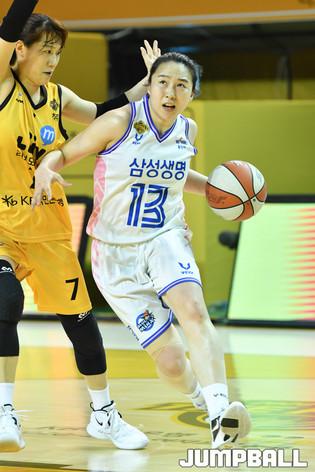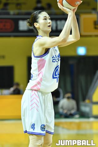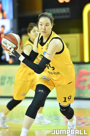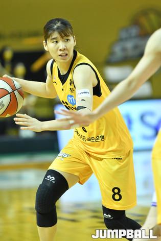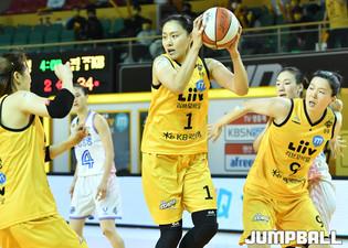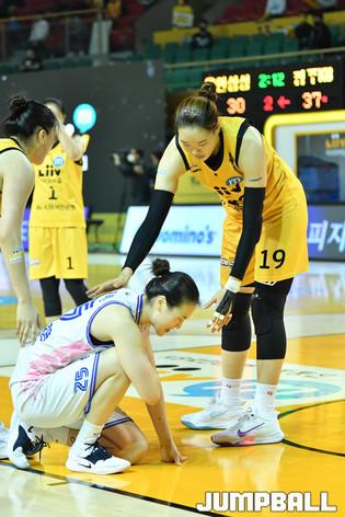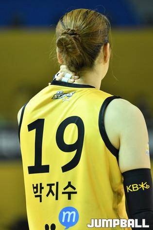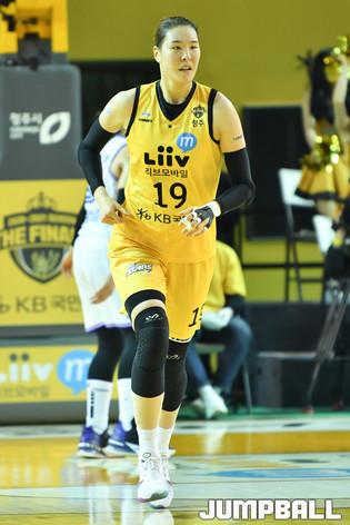 [점프볼=청주/유용우 기자] 11일 청주실내체육관에서 열린 'KB국민은행 Liiv M 2020-2021 여자프로농구' 청주 KB와 용인 삼성생명의 챔피언결정전 3차전, KB 박지수가 목부상을 입은 가운데 득점에 성공하고 백코트를 하고 있다.
