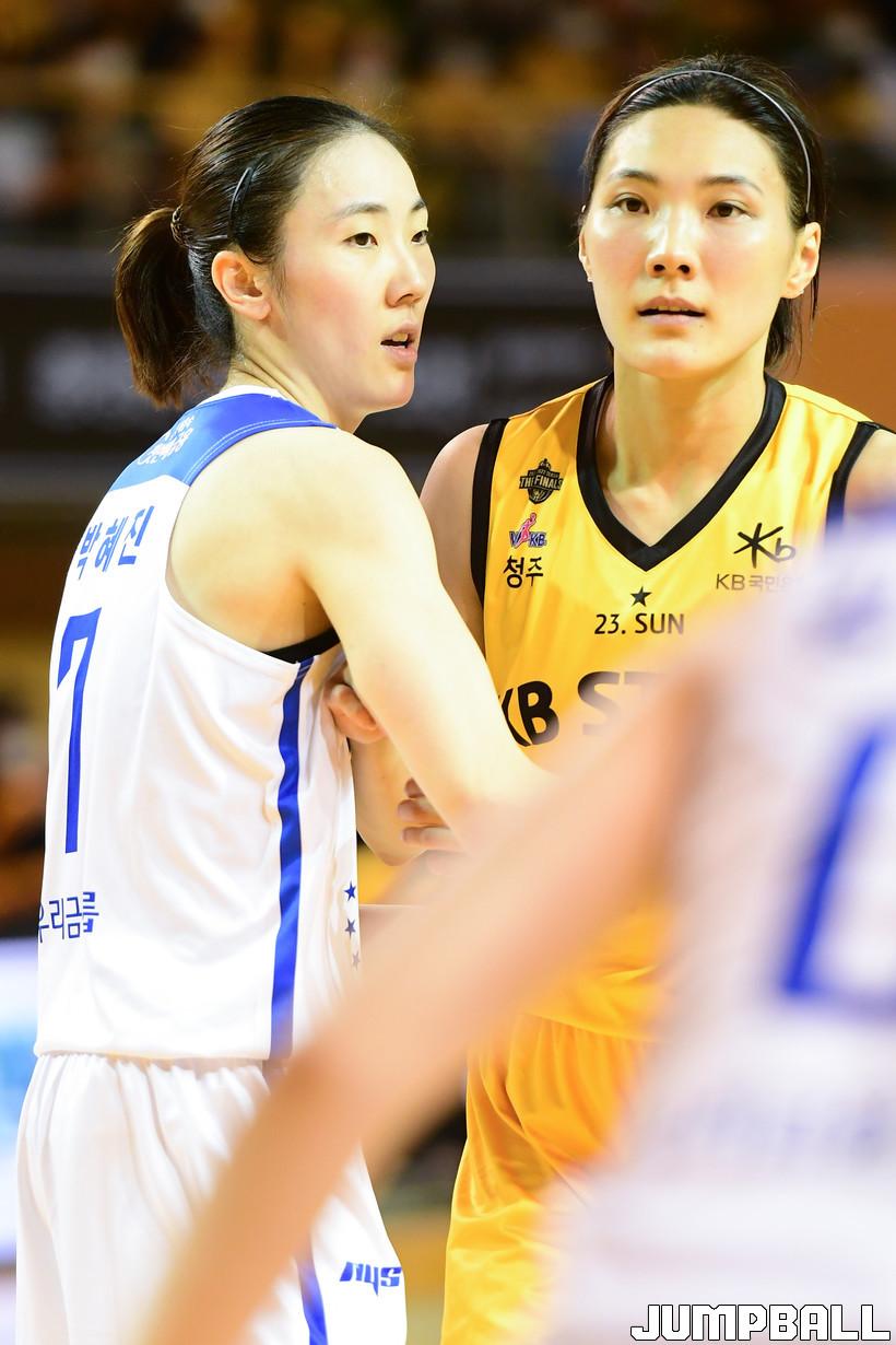 12일 청주실내체육관에서 열린 '삼성생명 2021-2022 여자프로농구 챔피언결정전 2차전' 청주 KB스와 아산 우리은행의 경기, 우리은행 박혜진이 KB 최희진을 수비하고 있다.