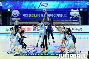 [점프볼=인천/박상혁 기자] 4일 인천도원실내체육관에서 열린 '하나원큐 2019-2020 여자프로농구' 인천신한은행과 용인삼성생명의 경기, 양팀의 무관중 경기가 점프볼로 시작되었다.