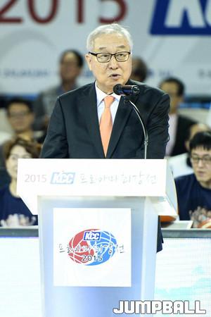 [점프볼=잠실/유용우 기자] KBL과 한국대학농구연맹이 주최하고 KBL이 주관하는 'KCC 2015 프로아마최강전'이 15일 잠실학생체육관에서 열렸다. 프로 10개팀과 대학 5개팀이 참가하였으며, 총 15경기를 진행하며 최강전을 치루게 된다. 김영기 총재가 대회 개막을 선언하고 있다.