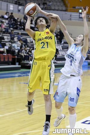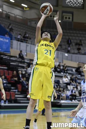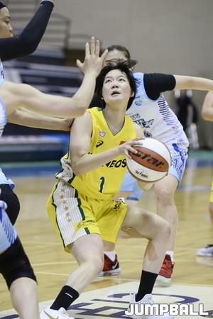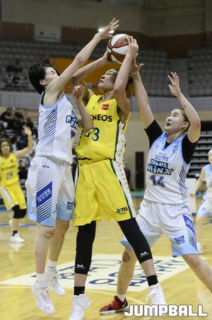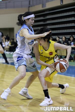 [점프볼/아산=홍기웅 기자] 18일 아산이순신체육관에서 열린 '한일 여자농구 클럽 챔피언십' 마지막 날 삼성생명과 JX의 경기. JX 니시야마 시노가 팔로 수비하면서 골밑 슛을 올라가고 있다.