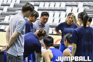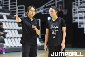 [점프볼=수원/홍기웅 기자] 27일 서수원칠보체육관에서 열린 '2018 우리은행 박신자컵 서머리그' 신한은행과 KDB생명의 경기. 신한은행 최윤아 코치가 하프타임을 이용해 선수들에게 직접 코치하고 있다.