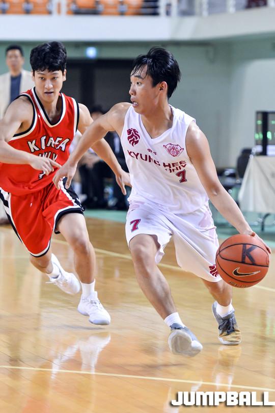 경기 초반, 4분까지는 경희대의 압도적 우세였다. 김동준(177cm, G)을 비롯해 권혁준(178cm, G)과 권성진(180cm, G) 등 작고 빠른 가드들이 중앙대의 느린 공수전환을 공략했다. 수비에서도 앞선을 강하게 압박하며 박진철(201cm, C)에게 향하는 패스를 모조리 차단했다.