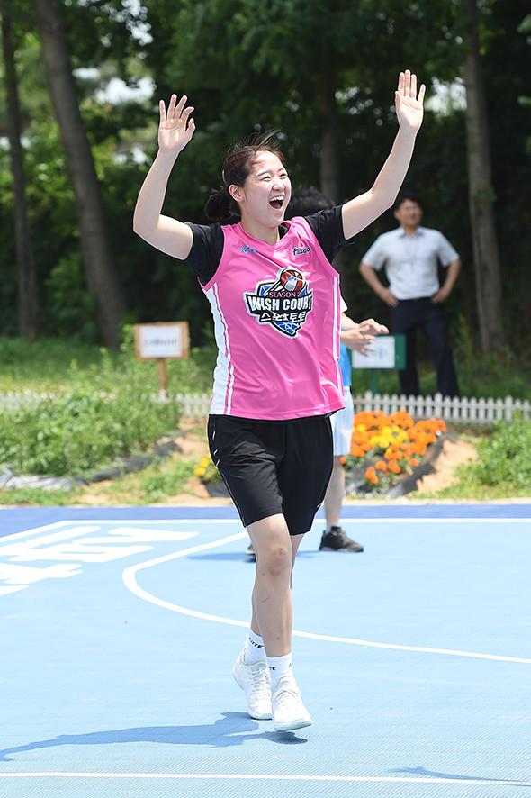 인천 신한은행 한엄지는 15일 경기도 평택 에바다 장애인 종합복지관에서 열린 W 위시코트 시즌2에 김이슬, 김연희, 김아름과 참석했다. 이번 행사는 2018-2019시즌 WKBL 선수들이 성공시킨 3점슛으로 1개당 3만원이 적립됐고, 그 기부금으로 학교, 저소득층, 소외계층 등에 새로운 코트를 만들어주는 방법으로 진행됐다.