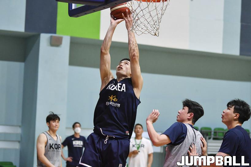 10일 저녁 인도네시아 자카르타 GBK 아레나에서 대한민국 남자 농구 대표팀이 현지에서 공식적인 첫 훈련을 가졌다. 대표팀 장재석이 동료의 패스를 받아 골밑슛을 올리고 있다.