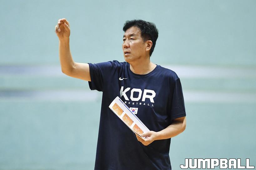 10일 저녁 인도네시아 자카르타 GBK 아레나에서 대한민국 남자 농구 대표팀이 현지에서 공식적인 첫 훈련을 가졌다. 대표팀 이훈재 코치가 선수 한명씩 지시를 건네고 있다.