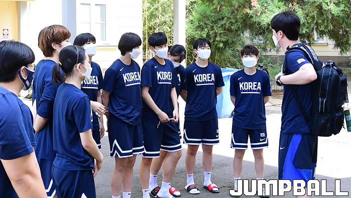 13일 헝가리 데브레첸 톱니 아르패드 세컨드아크 체육관에서 '2021 FIBA U19 여자농구월드컵' 에 참가중인 U19 여자대표팀이 오후 훈련을 실시했다. 박수호 감독이 선수들을 불러모아 이야기를 하고 있다.