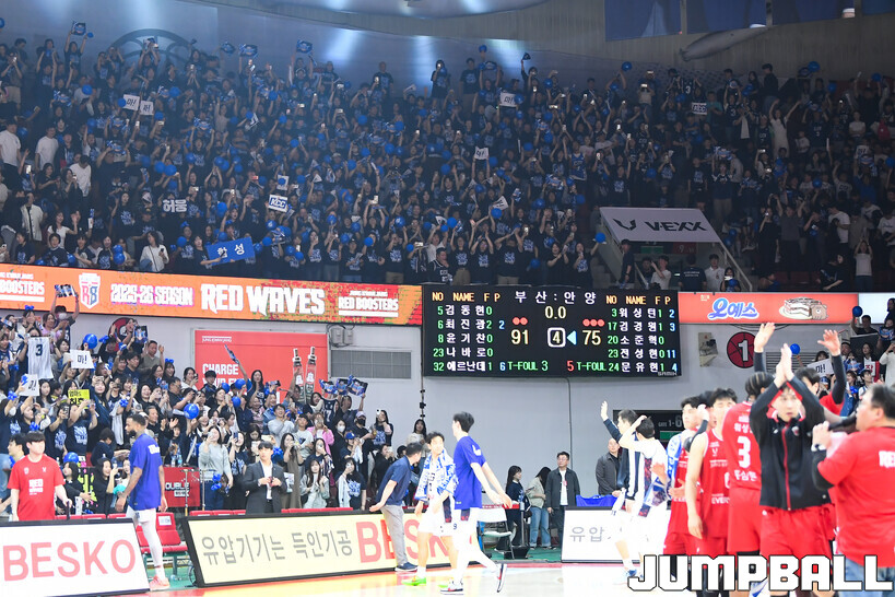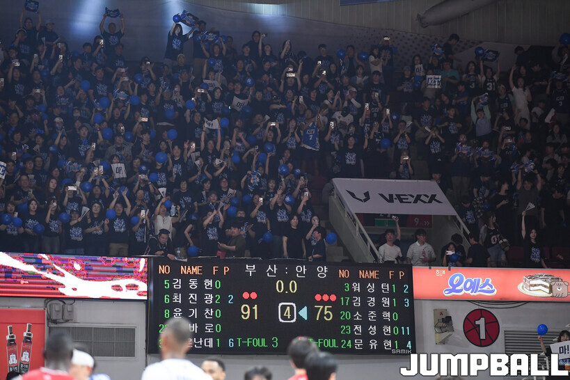 체육관을 가득 메운 KCC의 파란 물결은 또 하나의 장관을 연출했다. 응원 열기 역시 안양 홈 팬들의 분위기에 전혀 밀리지 않았다. ‘슈퍼팀’을 떠받친 ‘슈퍼팬’의 역할이 빛난 순간이었다.