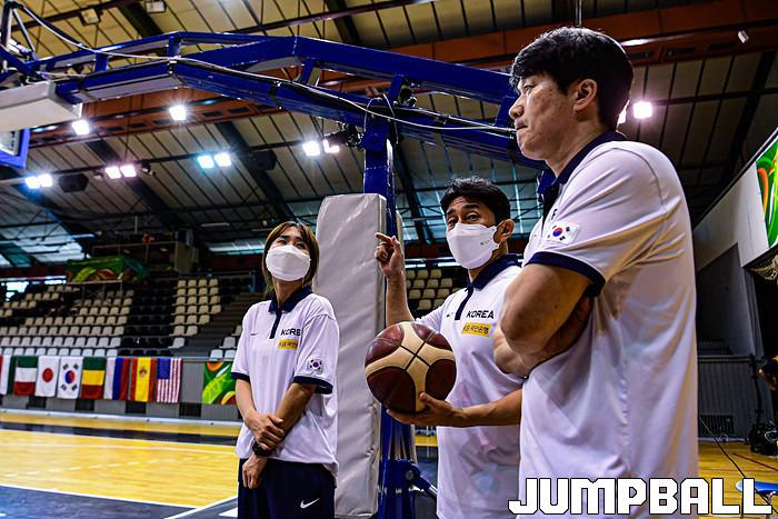 14일 헝가리 데브레첸 올라 가보르 스포츠홀에서 열린 '2021 FIBA U19 여자농구월드컵' 한국과 아르헨티나의 순위결정전 경기, 경기전 한국 박수호 감독과 이상훈 코치, 추연경 코치가 대화를 나누고 있다.