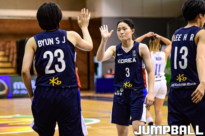 14일 헝가리 데브레첸 올라 가보르 스포츠홀에서 열린 '2021 FIBA U19 여자농구월드컵' 한국과 아르헨티나의 순위결정전 경기, 조수아가 변소정과 하이파이브를 하고 있다.
