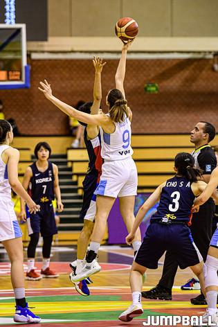 14일 헝가리 데브레첸 올라 가보르 스포츠홀에서 열린 '2021 FIBA U19 여자농구월드컵' 한국과 아르헨티나의 순위결정전 경기, 신예영이 코트에 있는 팀 동료가 득점을 올리자 환호하고 있다.