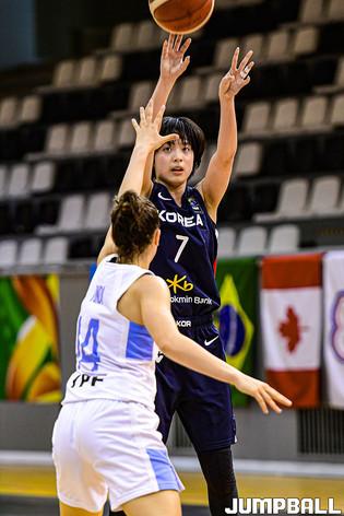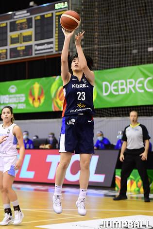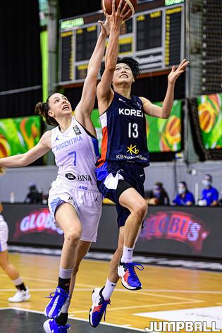 14일 헝가리 데브레첸 올라 가보르 스포츠홀에서 열린 '2021 FIBA U19 여자농구월드컵' 한국과 아르헨티나의 순위결정전 경기, 이상훈 코치가 선수들과 하이파이브를 하고 있다.