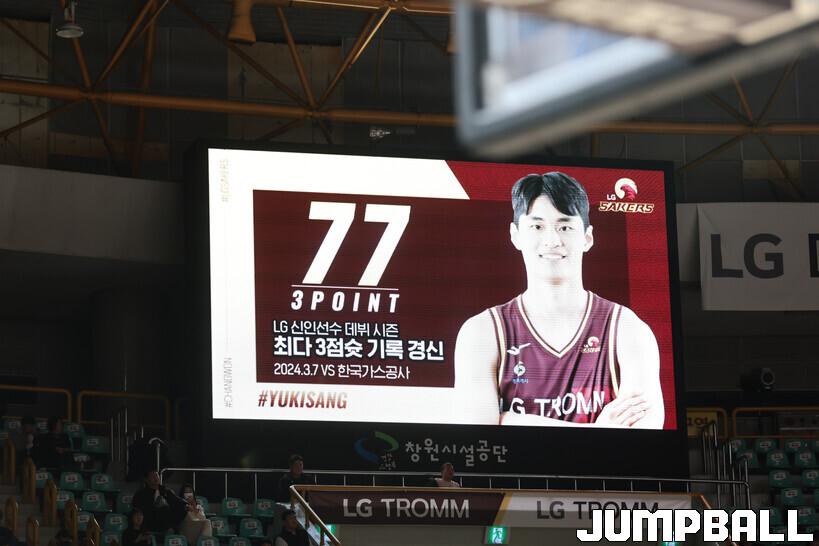 창원 LG의 신인 유기상은 7일 창원체육관에서 열린 대구 한국가스공사와 홈 경기(82-59)에서 3점슛 3개를 터트렸다. 이번 시즌에만 78번째 3점슛을 성공해 LG 신인 선수 데뷔 시즌 최다 3점슛 기록을 경신했다. 기존 기록은 2006~2007시즌 이현민의 76개였다.