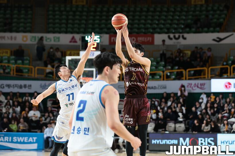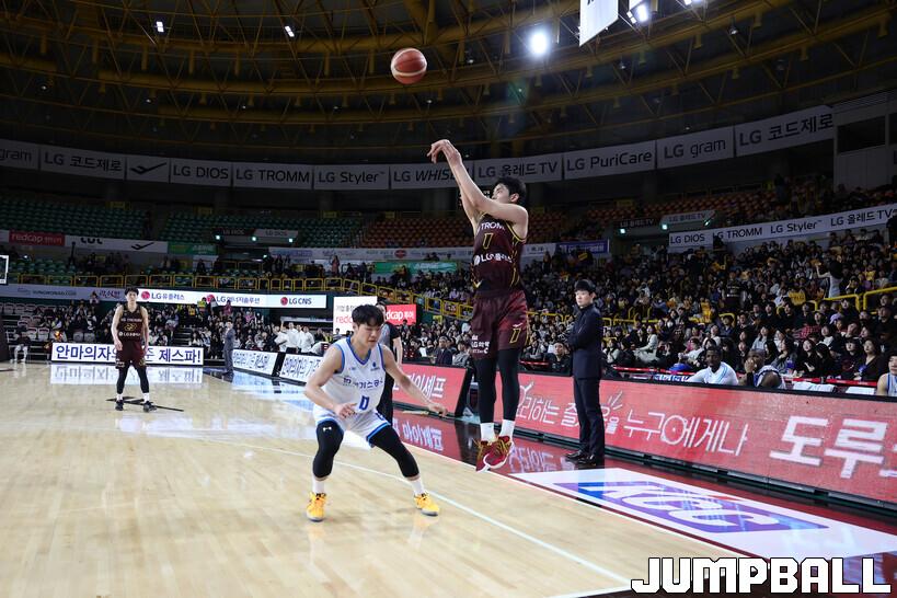 이날 1쿼터 2분 40초를 남기고 코트에 나선 유기상은 조상현 감독의 말처럼 기록 때문인지 슛 감각이 좋지 않았다. 그럼에도 2쿼터 6분 54초를 남기고 단짝인 양준석의 패스를 받아 이현민과 동률인 76번째 3점슛을 성공했다.