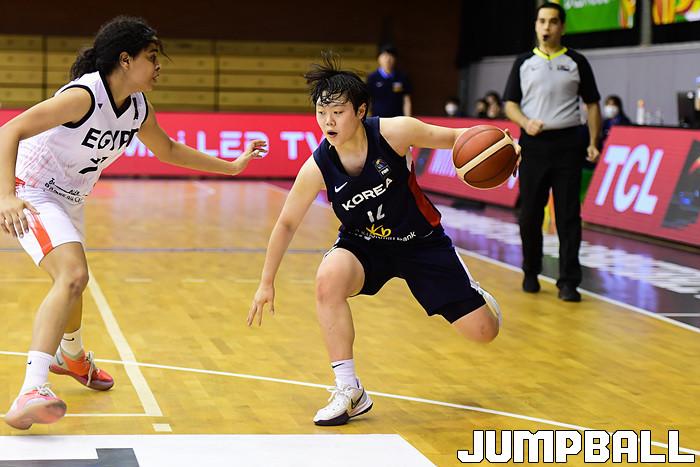 14일 헝가리 데브레첸 올라가보르 스포츠홀에서 열린 '2021 FIBA U19 여자농구월드컵' 한국과 이집트의 순위결정전 경기, 신예영이 공격을 시도하고 있다.
