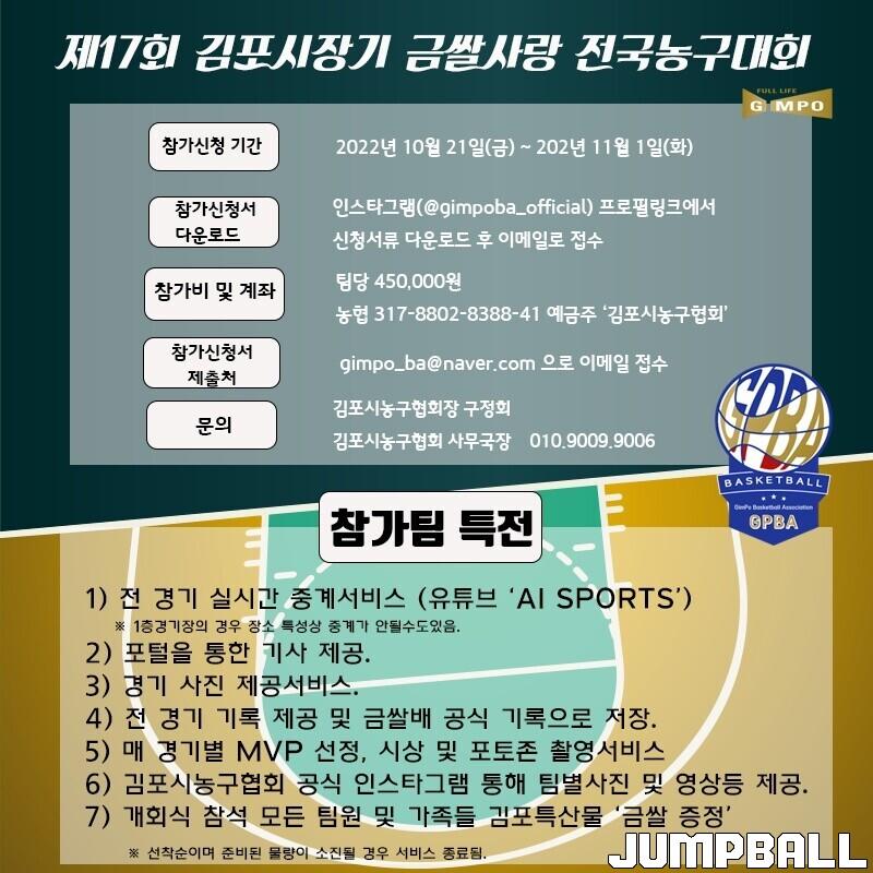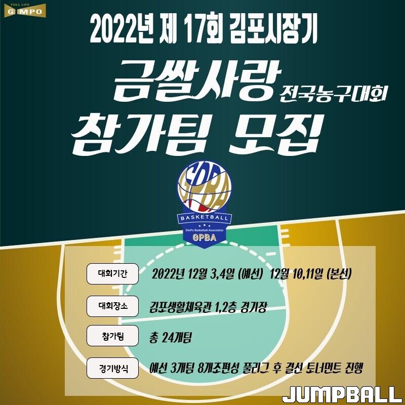 김포시농구협회(구정회 회장)는 '2022 제 17회 김포시장기 금쌀사랑 전국농구대회' 참가 팀 모집을 알렸다. 대회는 12월 3, 4일, 예선을 시작으로 12월 10, 11일에 본선이 이어진다.