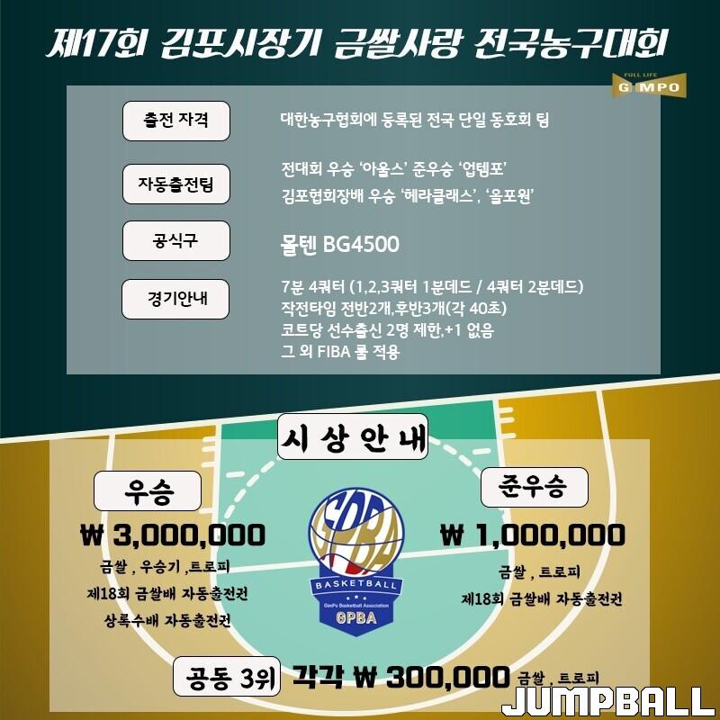 대회 장소는 김포생활체육관이며 대한농구협회에 등록된 전국 단일 동호회 팀이라면 참가할 수 있다. 경기는 7분 4쿼터(1,2,3쿼터 1분 데드/ 4쿼터 2분 데드), 코트당 선수출신은 2명의 제한, +1점은 없다.