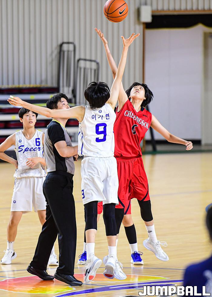 22일 경상북도 김천실내체육관에서 열린 2021 연맹회장기 전국남녀중고농구대회 김천대회 여중부 청솔중과 수피아여중 결승전 경기, 점프볼로 경기가 시작되었다.