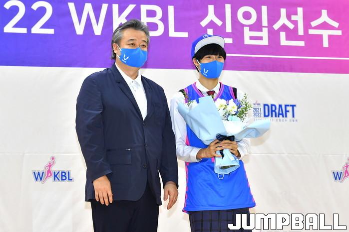 8일 용인 용인실내체육관에서 열린 2021-2022 WKBL 신입선수 선발회. 삼성생명 임근배 감독과 1순위로 지명된 이해란이 기념촬영을 하고 있다.