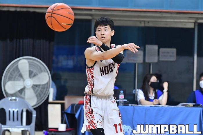 16일 김천실내체육관 보조체육관에서 열린 2021 연맹회장기 전국 남녀 중고 농구 김천대회 호계중과 안남중의 경기. 호계중 윤용준이 동료에게 체스트 패스를 건네고 있다.