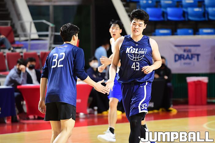 28일 잠실학생체육관에서 2021 KBL 신인선수 트라이아웃이 열렸다. 경희대 하승윤이 하이파이브를 하고 있다.