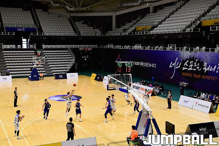 [점프볼=수원/박상혁 기자] 27일 서수원칠보체육관에서 열린 2021 KUSF 대학농구 U리그 명지대와 조선대의 경기, 무관중으로 경기가 펼쳐지고 있다.