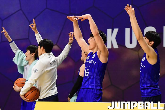 [점프볼=수원/박상혁 기자] 27일 서수원칠보체육관에서 열린 2021 KUSF 대학농구 U리그 명지대와 조선대의 경기, 명지대 선수들이 환호하고 있다.