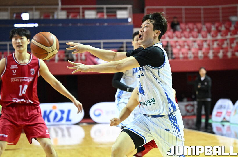 [점프볼=용인/문복주 기자] 3일 경희대 국제캠퍼스 선승관에서 열린 2025-2026 KBL D리그 안양 정관장과 대구 한국가스공사의 경기에서 한국가스공사 최창진이 골밑 사이드로 파고들어 패스를 하고 있다.