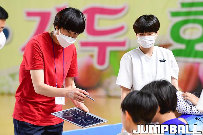 22일 경상북도 김천실내체육관에서 열린 2021 연맹회장기 전국남녀중고농구대회 김천대회 여고부 수원여고와 삼천포여고 결승전 경기, 삼천포여고 조문주 코치가 선수들에게 지시하고 있다.