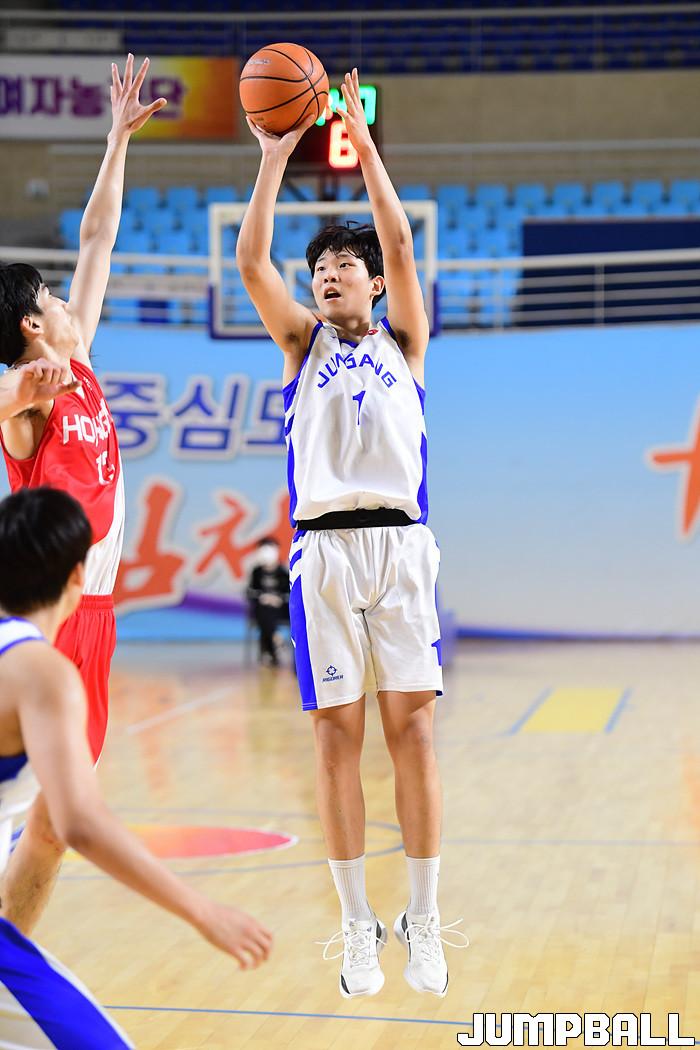 19일 김천실내체육관에서 열린 2021 연맹회장기 전국남녀중고농구 김천대회 남고부 홍대부고와 부산중앙고의 경기, 부산중앙고 우성희가 점프슛을 시도하고 있다.