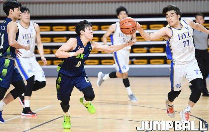27일 경북 상주실내체육관에서 열린 제37회 MBC배 전국대학농구 상주대회 준결승전으로 성균관대와 한양대의 경기, 성균관대 이현호와 한양대 박성재가 루즈볼을 다투고 있다.