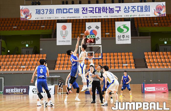 28일 경북 상주실내체육관에서 열린 제37회 MBC배 전국대학농구 상주대회 결승전으로 한양대와 연세대의 경기, 연세대 이원석이 경기시작 점프볼을 선점하고 있다.