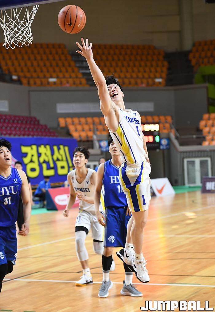 28일 경북 상주실내체육관에서 열린 제37회 MBC배 전국대학농구 상주대회 결승전으로 한양대와 연세대의 경기, 연세대 이정현이 골밑을 파도들어 득점을 하고 있다.