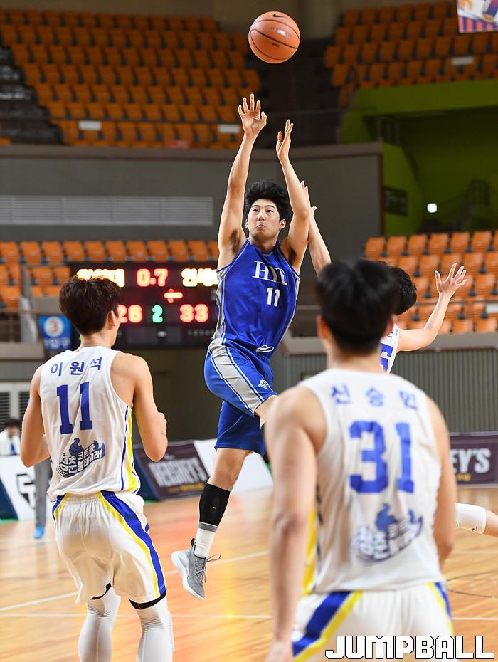 28일 경북 상주실내체육관에서 열린 제37회 MBC배 전국대학농구 상주대회 결승전으로 한양대와 연세대의 경기, 한양대 김형준이 2쿼터 종료직전 점프슛을 시도하고 있다.
