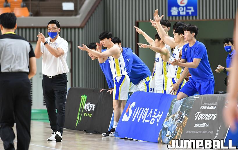 20일 경상북도 상주실내체육관에서 열린 제38회 MBC배 전국대학농구 상주대회에 경희대와 연세대의 준결승전으로 연세대 윤호진 감독 대행과 벤치 선수들이 환호하고 있다.