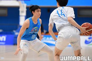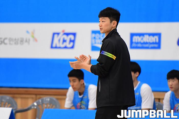 5일 강원도 양구에 위치한 양구 청춘체육관에서 포카리 스웨트 히어로즈 2021 KBL 유스 엘리트 캠프 4일차가 진행되었다. 김명진 코치가 선수들을 독려하고 있다.