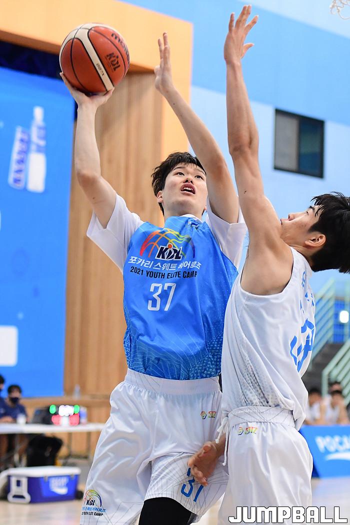 5일 강원도 양구에 위치한 양구 청춘체육관에서 포카리 스웨트 히어로즈 2021 KBL 유스 엘리트 캠프 4일차가 진행되었다. 용산고 김윤성이 골밑에서 슛을 시도하고 있다.