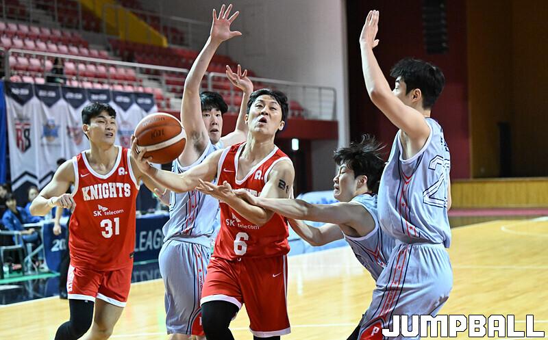 [점프볼=용인/문복주 기자] 21일 경희대 선승관 체육관에서 열린 2025-2026 KBL D리그 서울 SK와 울산 현대모비스의 경기에서 SK 전성환이 골밑을 파고들어 수비에 막히자 패스를 하고 있다.