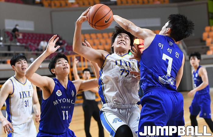 26일 경북 상주실내체육관에서 열린 제37회 MBC배 전국대학농구 상주대회 준준결승전으로 명지대와 한양대의 경기, 한양대 박성재가 골밑에서 리바운드를 다투고 있다.