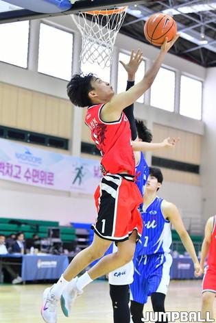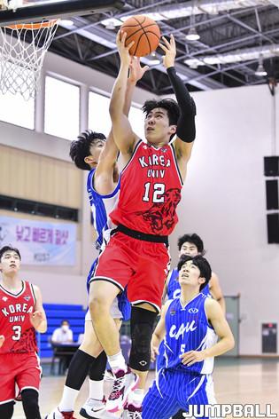 2일 충주 건국대학교 글로컬캠퍼스 건국체육관에서 열린 2021 KUSF 대학농구 U리그 플레이오프 중앙대와 고려대의 경기. 중앙대 홍현준이 돌파후 레이업을 올려넣고 있다.