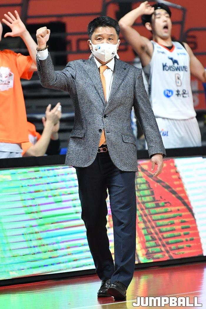 [점프볼=고양/유용우 기자] 10일 고양실내체육관에서 열린 2020-2021 현대모비스 프로농구 고양 오리온과 인천 전자랜드의 6강 플레이오프 1차전, 전자랜드 유도훈 감독이 선수들의 플레이에 만족감을 드러내고 있다.