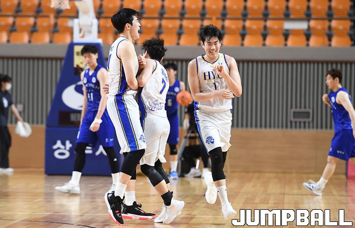 26일 경북 상주실내체육관에서 열린 제37회 MBC배 전국대학농구 상주대회 준준결승전으로 명지대와 한양대의 경기, 한양대 전준우가 동료들과 함께 환호하고 있다.