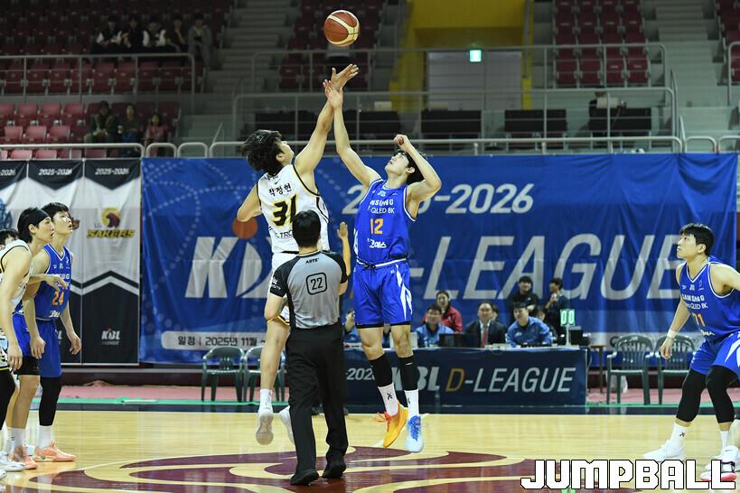 [점프볼=용인/유용우 기자] 24일 경희대 선승관 체육관에서 열린 2025-2026 KBL D리그 서울 삼성과 창원 LG의 경기가 점프볼로 시작되고 있다.