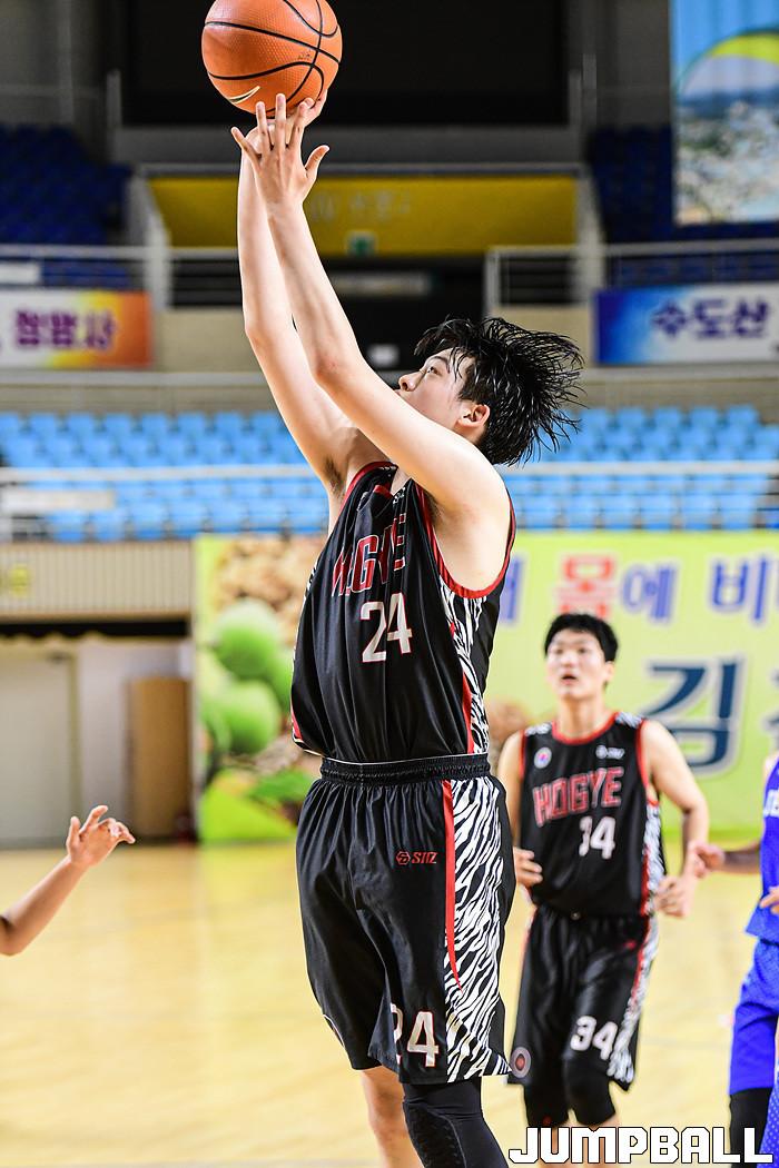 20일 김천실내체육관에서 열린 2021 연맹회장기 전국남녀중고농구 김천대회 남중부 호계중과 전주남중 4강 경기, 호계중 정재엽이 골밑슛을 시도하고 있다.