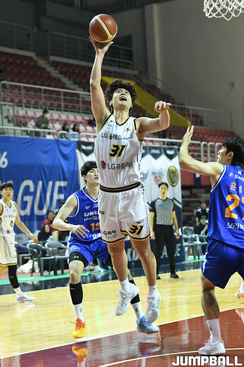 [점프볼=용인/유용우 기자] 24일 경희대 선승관 체육관에서 열린 2025-2026 KBL D리그 서울 삼성과 창원 LG의 경기, LG 박정현이 골밑 득점을 올리고 있다.