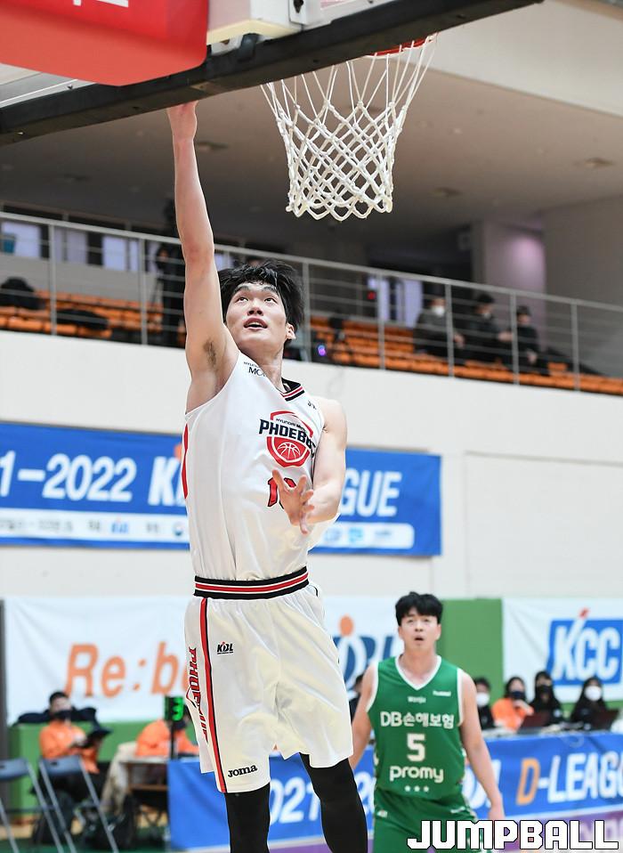 18일 이천 LG 챔피언스파크에서 열린 2021-2022 KBL D-리그 원주 DB와 울산 현대모비스의 경기, 현대모비스 정종현이 속공으로 레이업을 시도하고 있다.