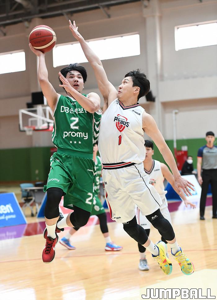 18일 이천 LG 챔피언스파크에서 열린 2021-2022 KBL D-리그 원주 DB와 울산 현대모비스의 경기, DB 이용우가 상대수비를 달고 슛을 시도하고 있다.